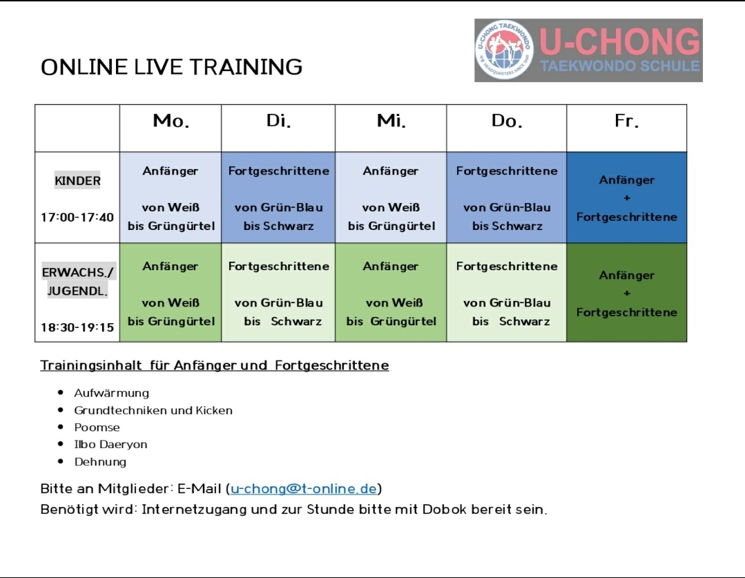 Ab kommenden Dienstag bieten die U-Chong-Taekwondo-Schulen ein Live-Onlinetraining mit den koreanischen Großmeistern an. Für alle Mitglieder der Kampfsportabteilung die daran teilnehmen möchten, hier die Infos zum Ablauf: